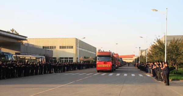 最后,發(fā)貨車輛啟動,參會人員列隊(duì)馬路兩邊,歡送滿載成品的車輛啟程。